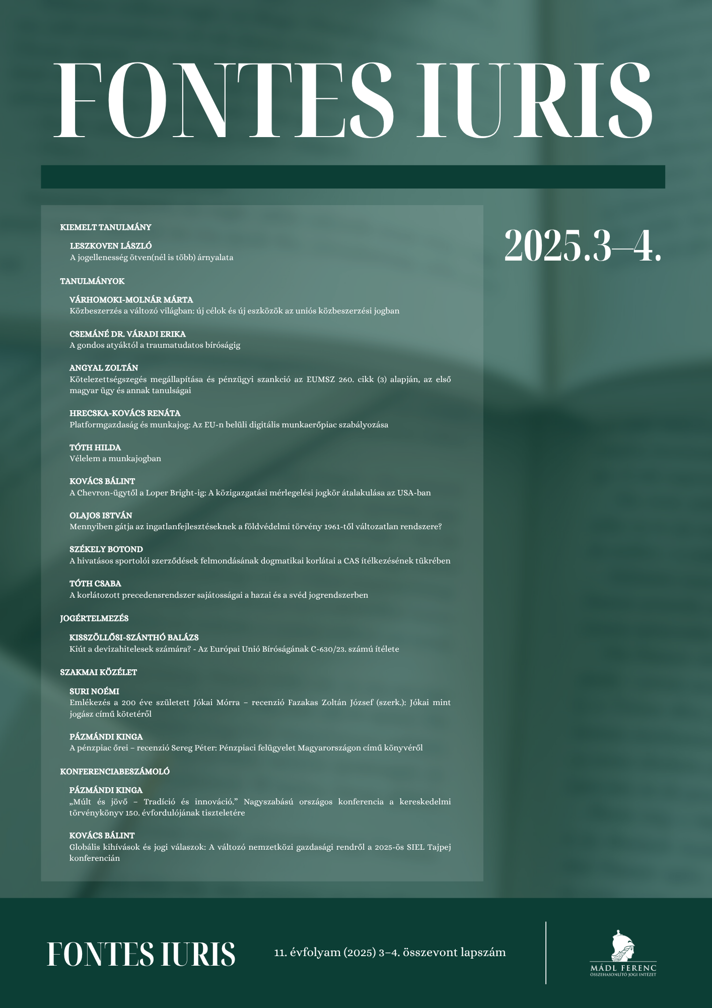 A Fontes Iuris 2025. évi 3-4. összevont száma a jogtudomány tág palettájáról válogat. Jelen folyóiratszámban a klasszikus magánjogi kérdések mélyebb elemzései, valamint egészen speciális szakjogági tanulmányok is olvashatók.